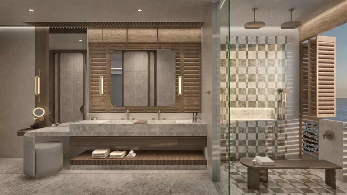 The bathrooms are luxurious retreats, far beyond mere utility. With floor-to-ceiling marble, rainfall showers, and soaking tubs, daily routines transform into indulgent spa-like experiences.