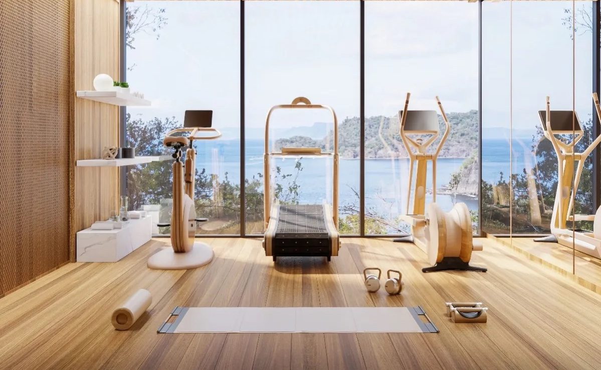 The first floor currently serves as a gym and spa but can be adapted for use as an office, lounge, or entertainment room.