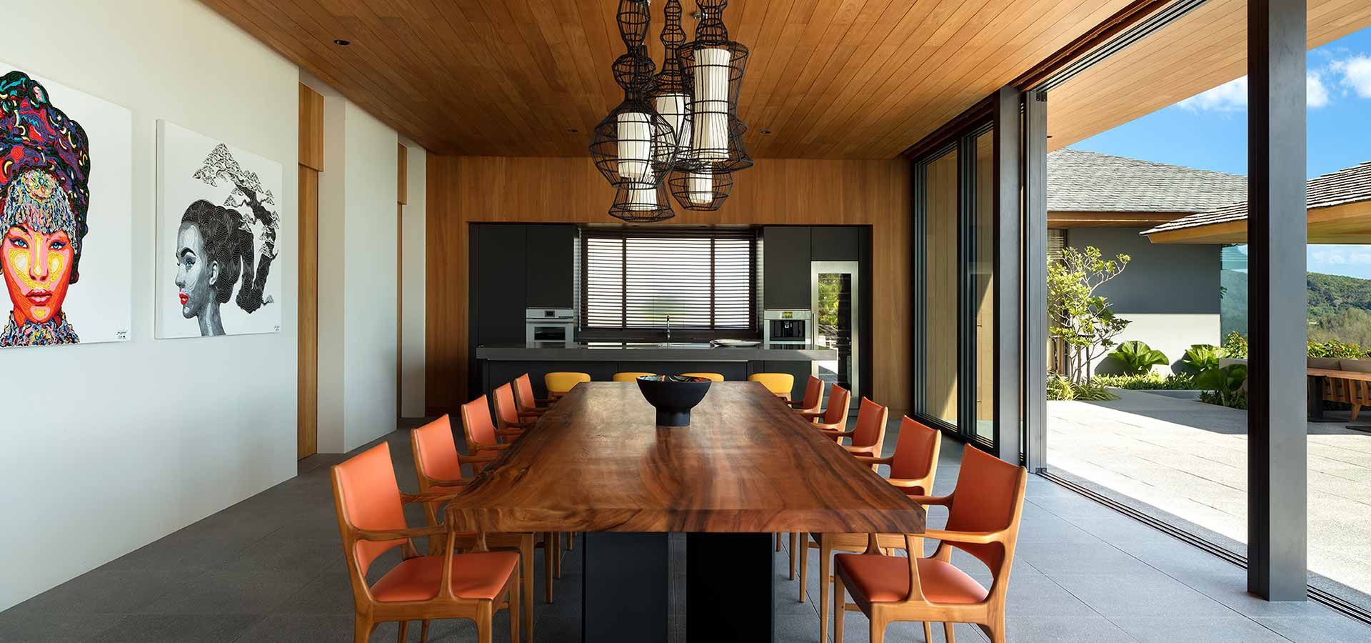 The dining area features an impressive show kitchen, the granite floor tiles and teak ceiling’s seamlessly connect the indoor and outdoor areas.