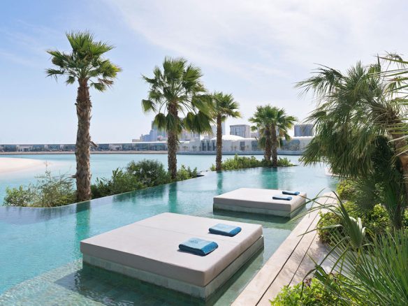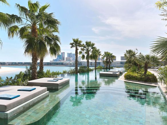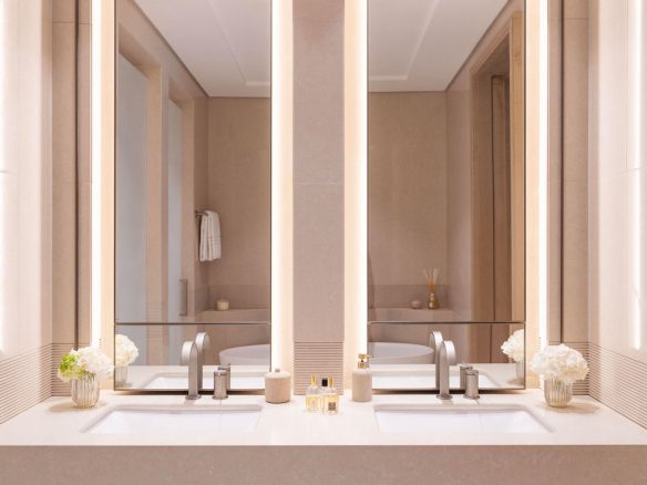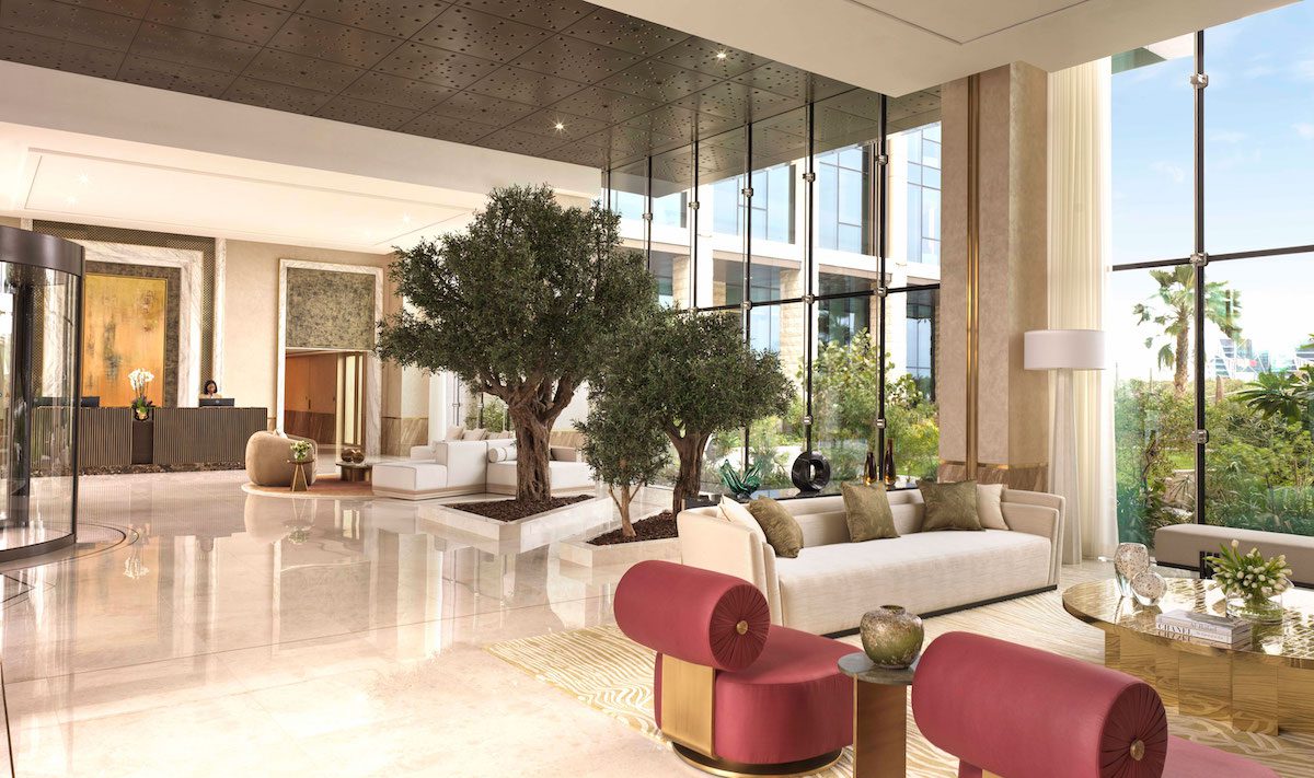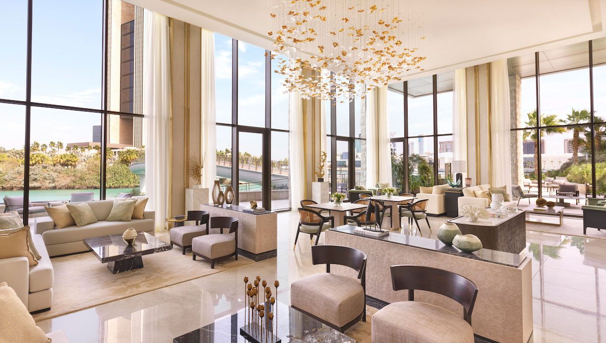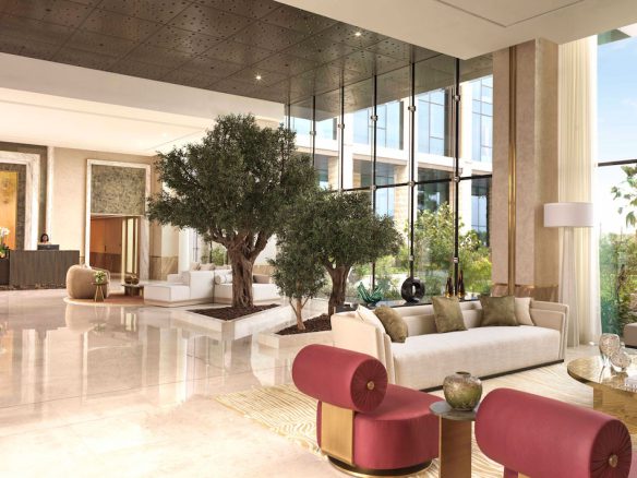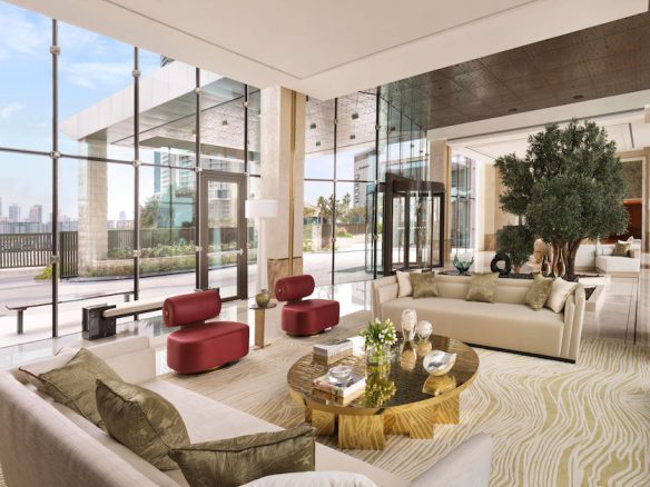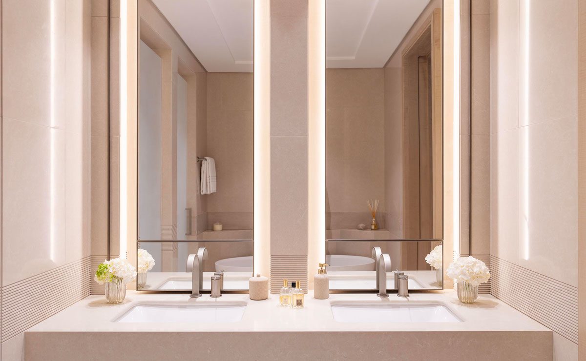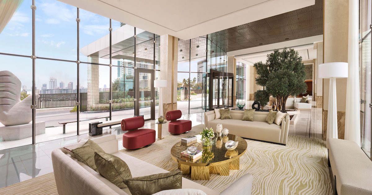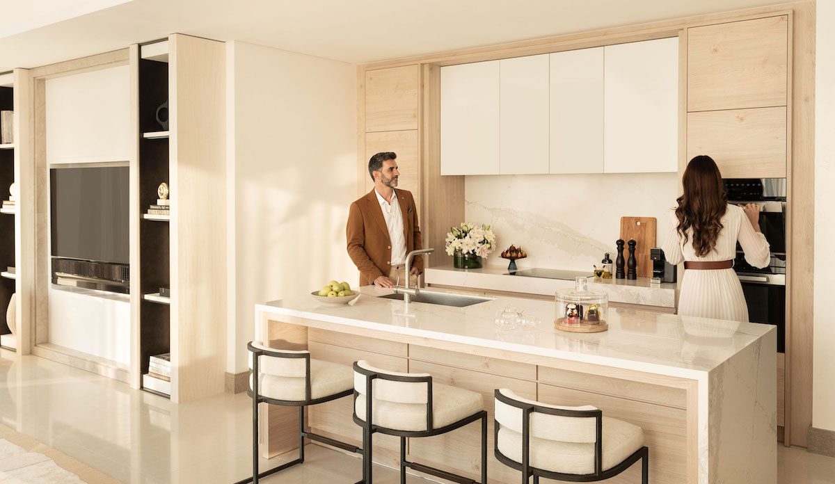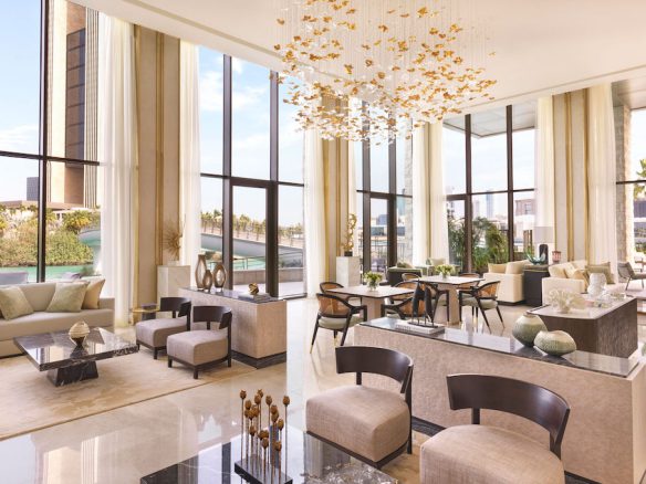 A private elevator leads right to the door of your residence, where the soothing interiors are bathed in natural light by floor-to-ceiling windows. Hand-carved plaster intertwines with mother of pearl and details in brass, as views out over turquoise seas beckon you inside.