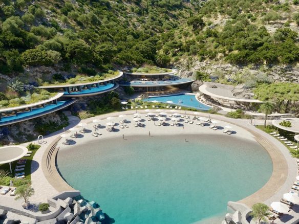 The distinctive design is shaped around the curvature and slope of the hilltop, creating a series of layered terraces and pools with extraordinary sea views.