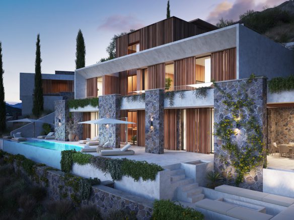 Each luxury residence ranging in size (271-490 m²) sits on a large plot (up to 2,200 m²) and incorporates a spacious terrace with a large private swimming pool, landscaped gardens, and private parking.